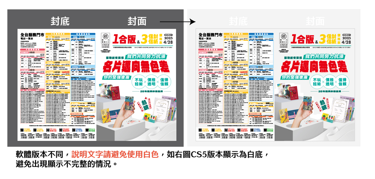 填色勿設定四色黑(CMYK100%)以免造成背印。